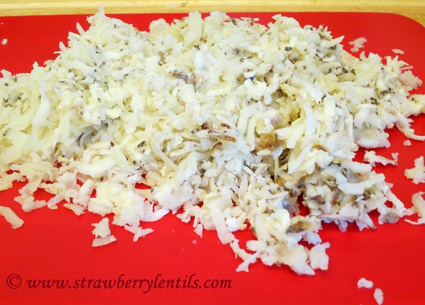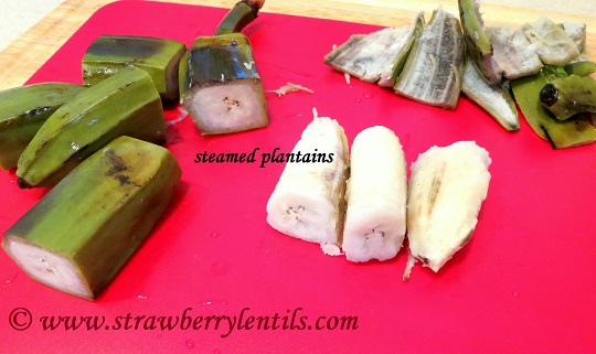• Steam the plantains with their skin on, either in a steam basket or in an idli maker. You can also drop them in boiling water and cook for 5 minutes. If the plantains are overcooked, the dish wont turn out that great. Once the plantains are steamed , allow them to cool down completely , peel off their skins and grate them. If you are using potatoes, shred the steamed potatoes with hands instead of grating, and avoid using the potato masher.