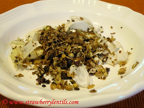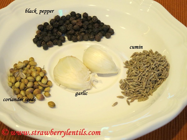 - Crush black pepper, cumin, coriander seeds and garlic coarsely. Crush them enough to break to release flavor. Do not make it into a fine paste /powder.