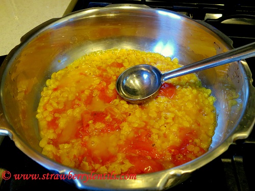 - Once the dal is soft , mash the tomatoes and dal with the back of a spoon or ladle. If your dal doesn’t mash easily, you need to cook a little longer.