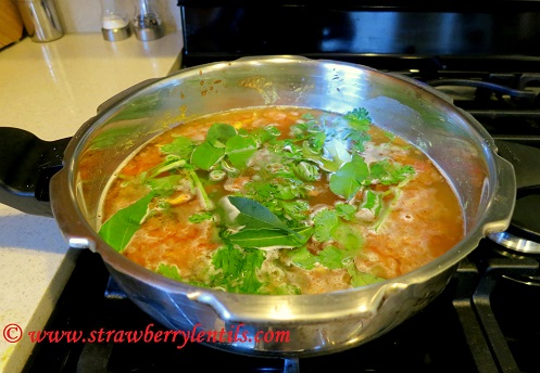 It is very important to cover the pot with lid and let the rasam sit for at least ten minutes before serving. After ten minutes when you open the lid, you will have your zen moment, thanks to the aroma from curry leaves, cilantro and the spice blend, all married into one aromatic rasam.