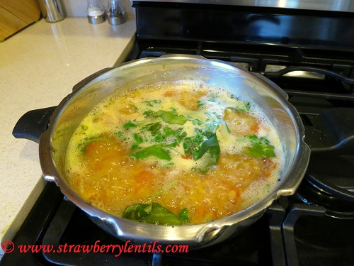 - Add 4 – 5 cups of water to the mashed dal and tomatoes. Add salt to taste. Also add half of the curry leaves and cilantro.