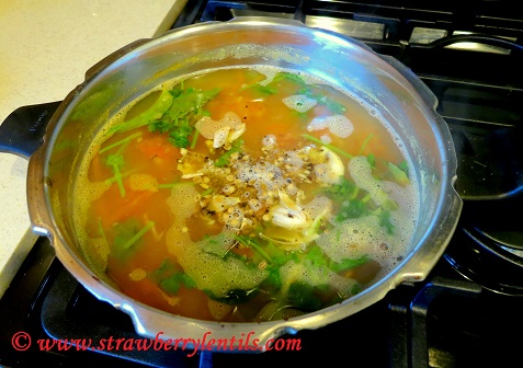 There are many versions of rasam. This recipe is of “Paruppu Rasam”, rasam made with ‘paruppu’ or ‘dhal’ or lentils. Having been a meat eater once has its advantage, I can pin point what is missing in the vegetarian version of a recipe. Soups are definitely not the same when you replace chicken stock with vegetable stock. But you can get the warm taste in vegetable soups by adding dhal water. I guess its the protein :).