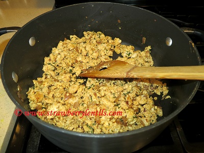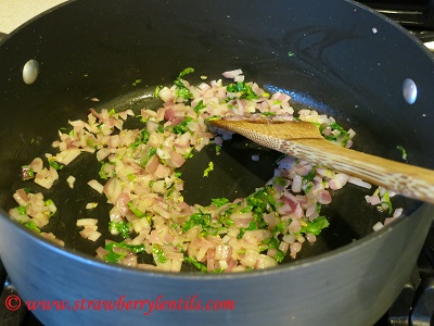 - To make the filling : In a pot, add 2 tsp of oil, fry the fennel. Then saute the chopped onions, green chillies and cilantro. Also add the ginger garlic paste and saute until the flavors come out.