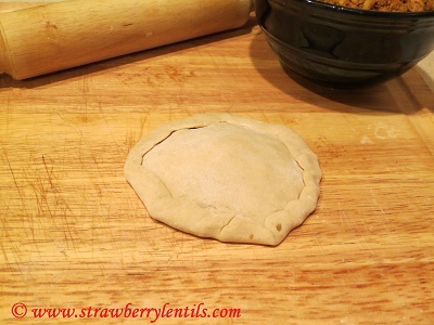 - Cover the filling with the other puri and twist and press the edges together for sealing.