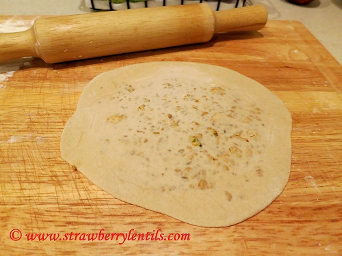 - Now roll out this stuffed puri gently to about 4-5 inches in diameter. Make sure the filling is evenly spread, and not clunked up on one side.