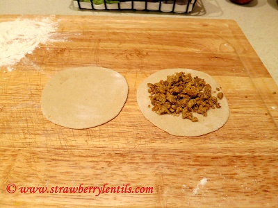 - Roll out 2 balls to about 2 inches in diameter (like puris). Place the filling on one.