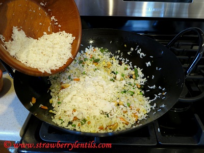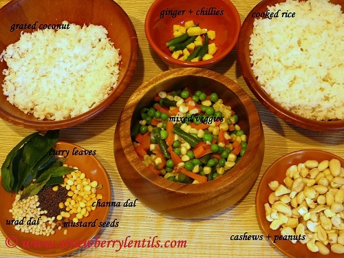 • Check for seasoning, add salt if needed. Three green chillies should pack enough punch, but if you need more heat you can add red pepper flakes. Finally add the grated coconut and mix with rice thoroughly, remove from heat after a minute.