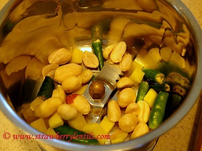 • Grind green  chillies and ginger along with a few peanuts to a coarse mix. It doesn’t have to be a paste, just grind enough to blend everything. Else, you can just finely mince the chillies and ginger.