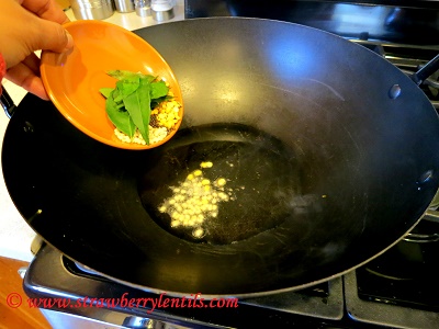 • In a wok, add a tbsp of oil (preferably coconut oil or sesame oil) and fry the mustard seeds, urad dal, channa dal and the curry leaves.