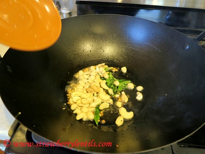 • When the mustard seeds splutter and the dals turn golden add the peanuts and cashewnuts.