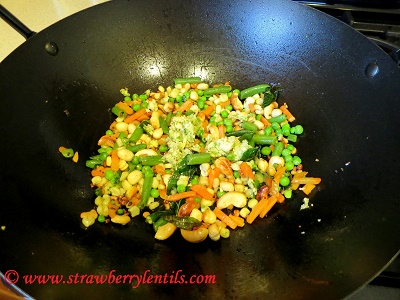 • When the nuts turn slightly golden add the mixed vegetables. This is optional,I prefer adding a lot of veggies to the rice, so that I can skip making a side 🙂 . Sprinkle some salt and cook for two minutes and then add the ground green chillies+ginger paste.