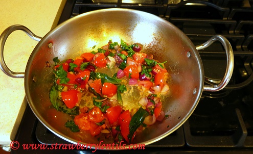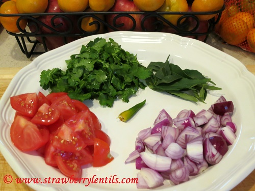 • In a pot, heat a spoon of oil and saute the onions, tomatoes, green chillies, curry leaves and cilantro.