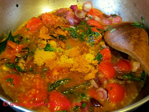 • When the onions and tomatoes soften add the tamarind water, turmeric, sambar powder, brown sugar and salt. Tamarind is optional, you can just add more tomatoes instead. Also if you don’t have sambar powder , use chilli powder and coriander powder.