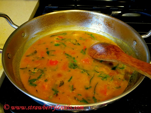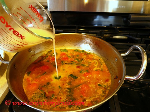 • Add about half a cup of water and bring the curry to boil, and then mix in the diluted gram powder solution.