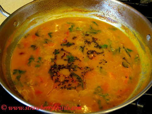 • In a separate pan, heat 1/2 tsp of ghee and fry the mustard seed and urad dal and add it to the sambar.