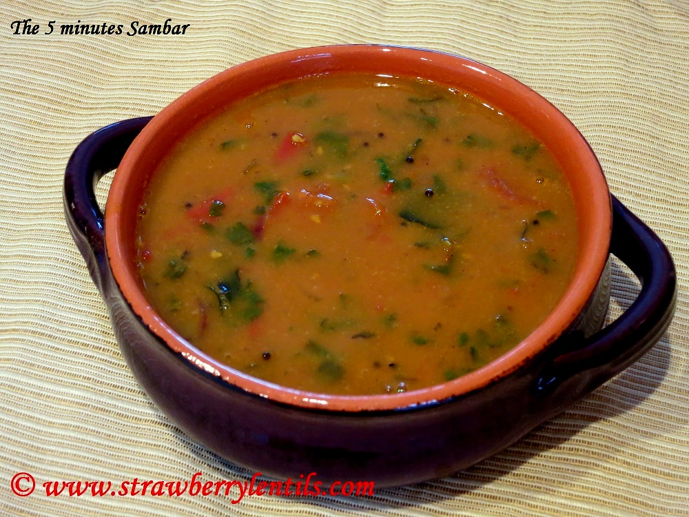Being a south Indian, sambar is our staple curry. I can make a pot of sambar , serve with rice for lunch and then serve with idlis or dosas for dinner, or serve with vadas for appetizers ,or as lentil soup, it is truly multi-purpose. Made with lentils and vegetables , it ranks high on nutritional value too. To make sambar in traditional way is not at all complicated, cook your lentils, cook your vegetables, add tamarind and sambar powder, add your favorite seasoning, temper with some ghee…..and that is all there is to it. But the lentils do take some time to cook, so it is not something you can make when you are trying to fix a meal in 10 minutes.