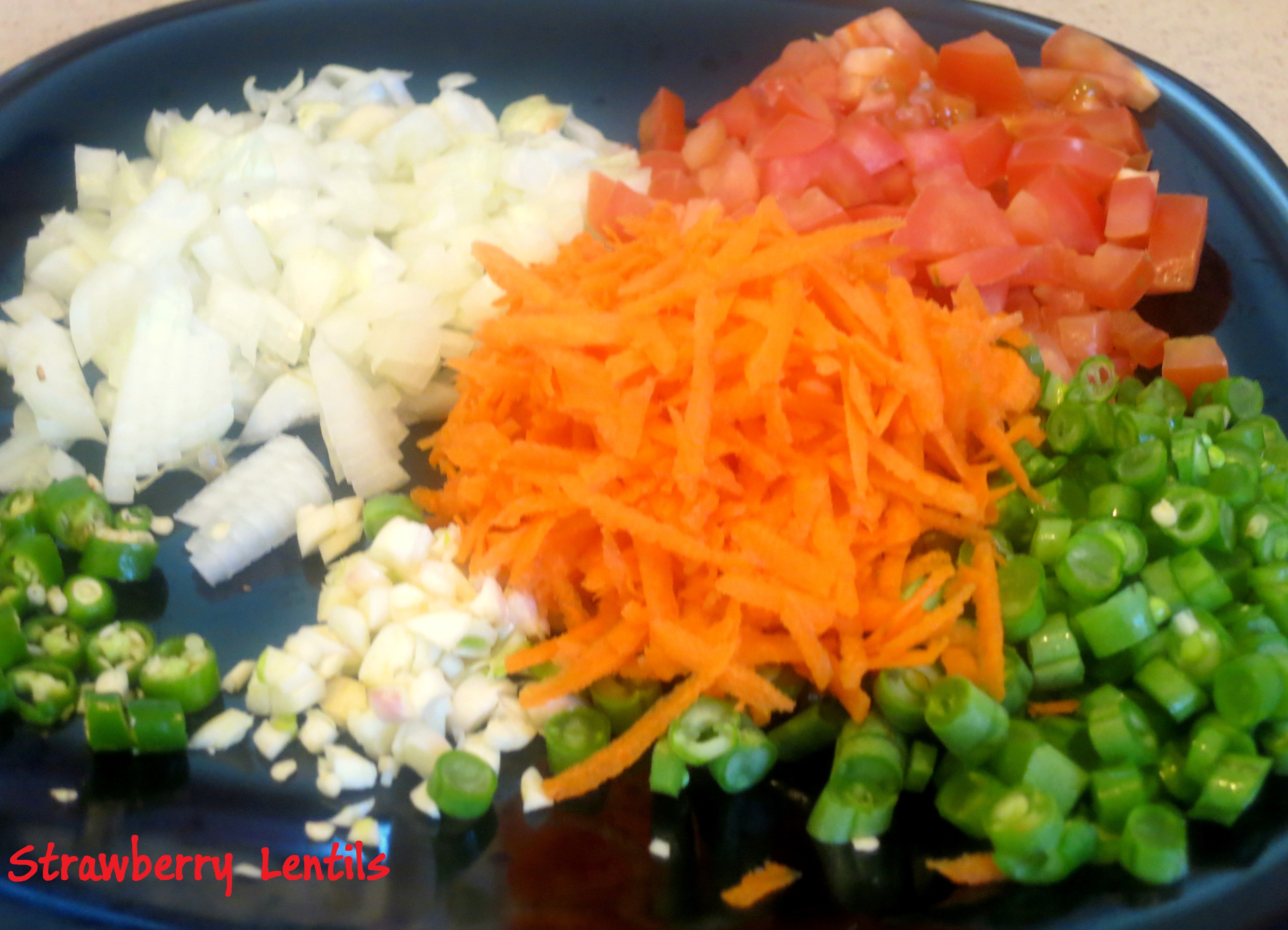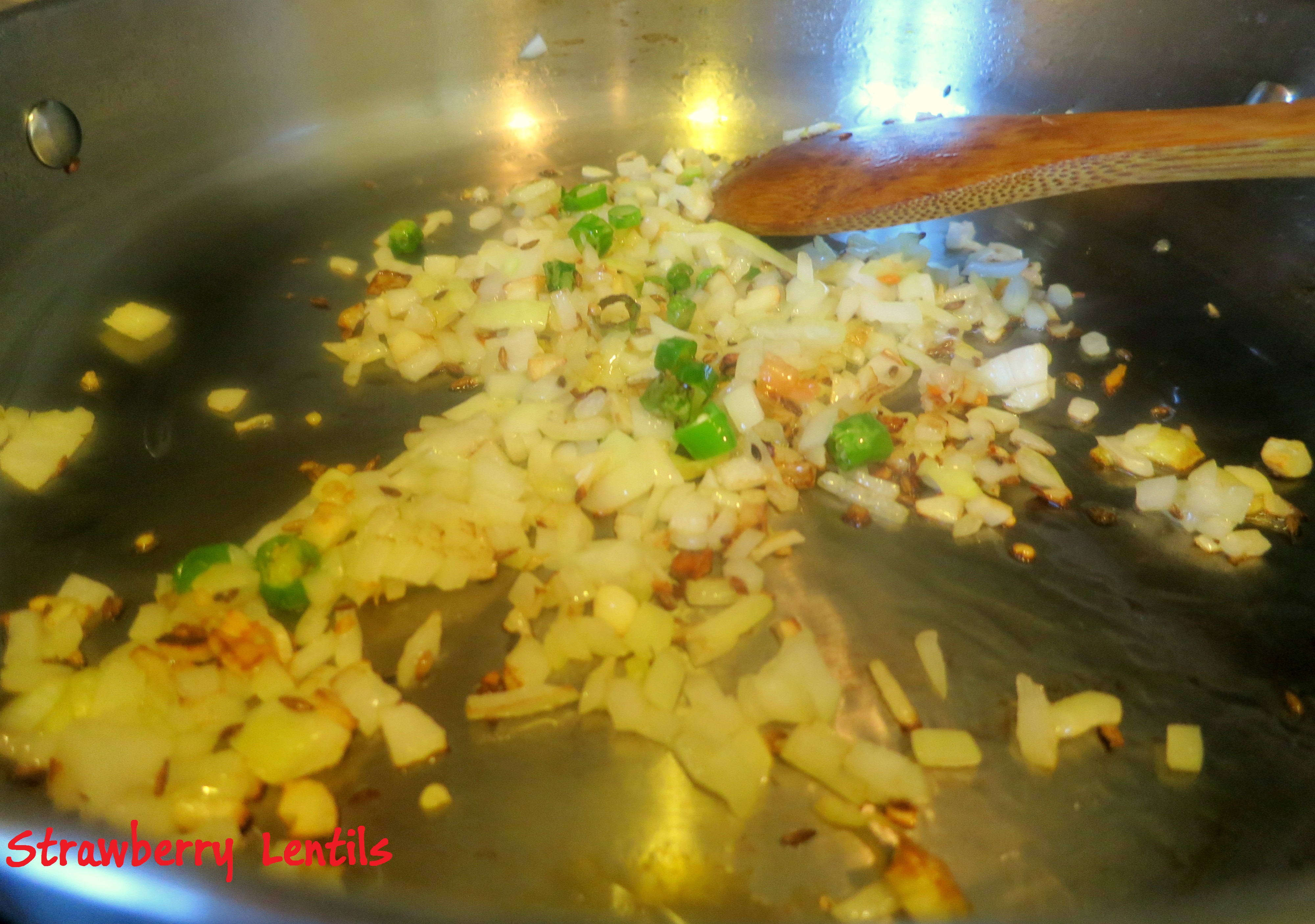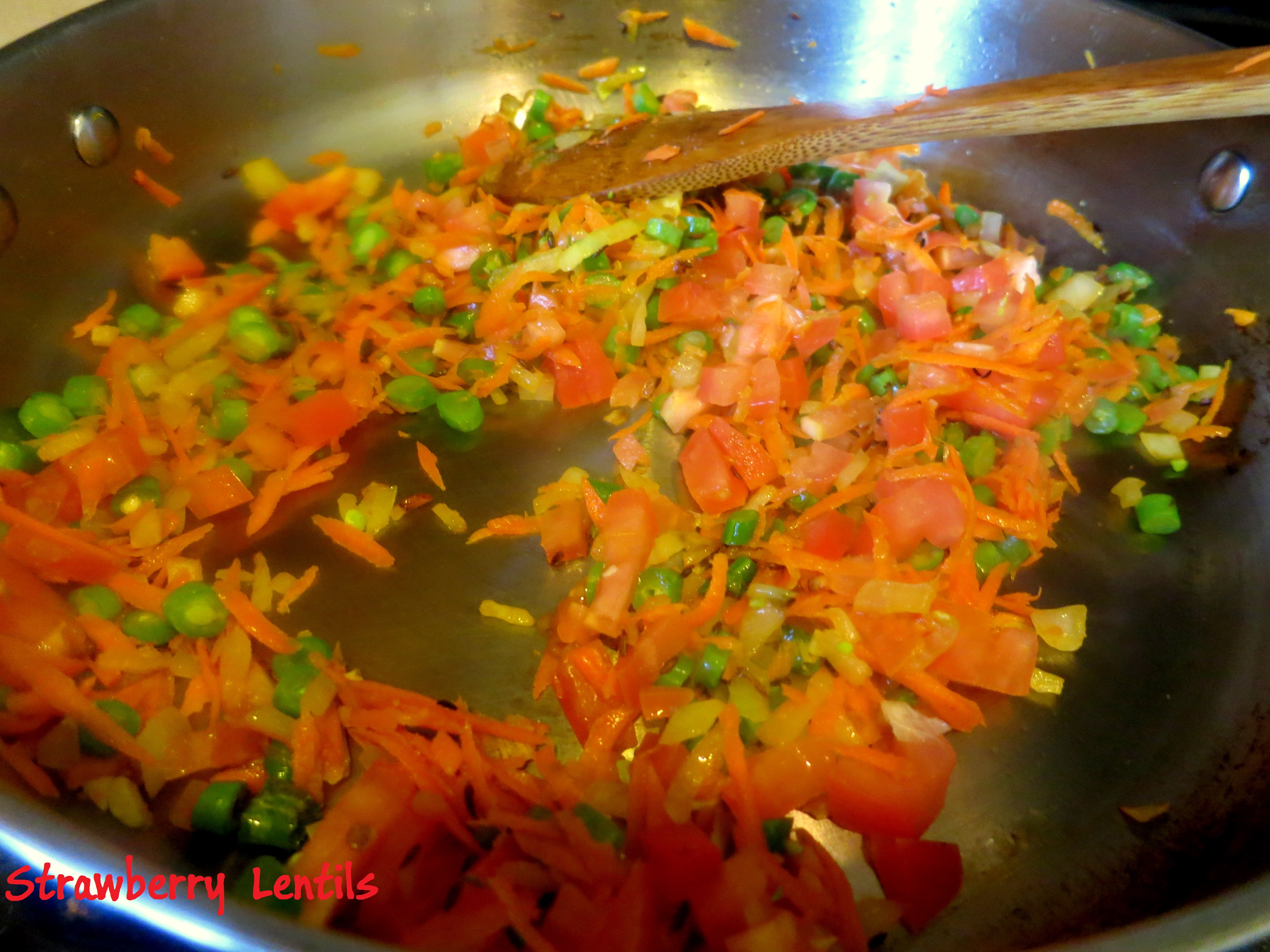 - In a pot, heat a spoon of oil, and fry seasoning of your preference. I fried mustard seeds and urad dhal as I like the nutty flavors they bring. You can use cumin instead or garam masala (cloves, cinnamon and cardamon). Then saute the onions until translucent, and then the green chillies and ginger and the finally add the carrots, beans and peas. Add salt to sweat the veggies.