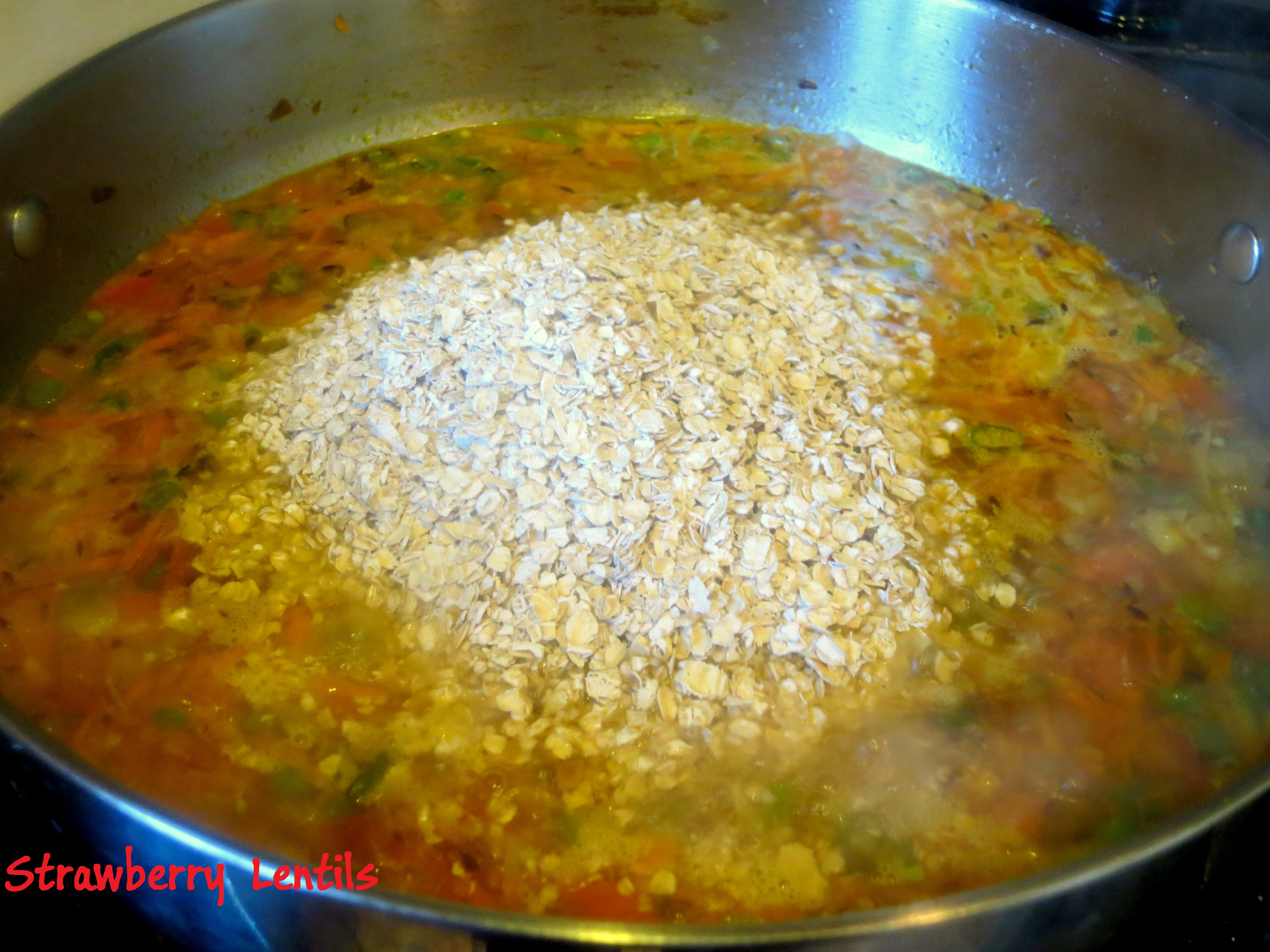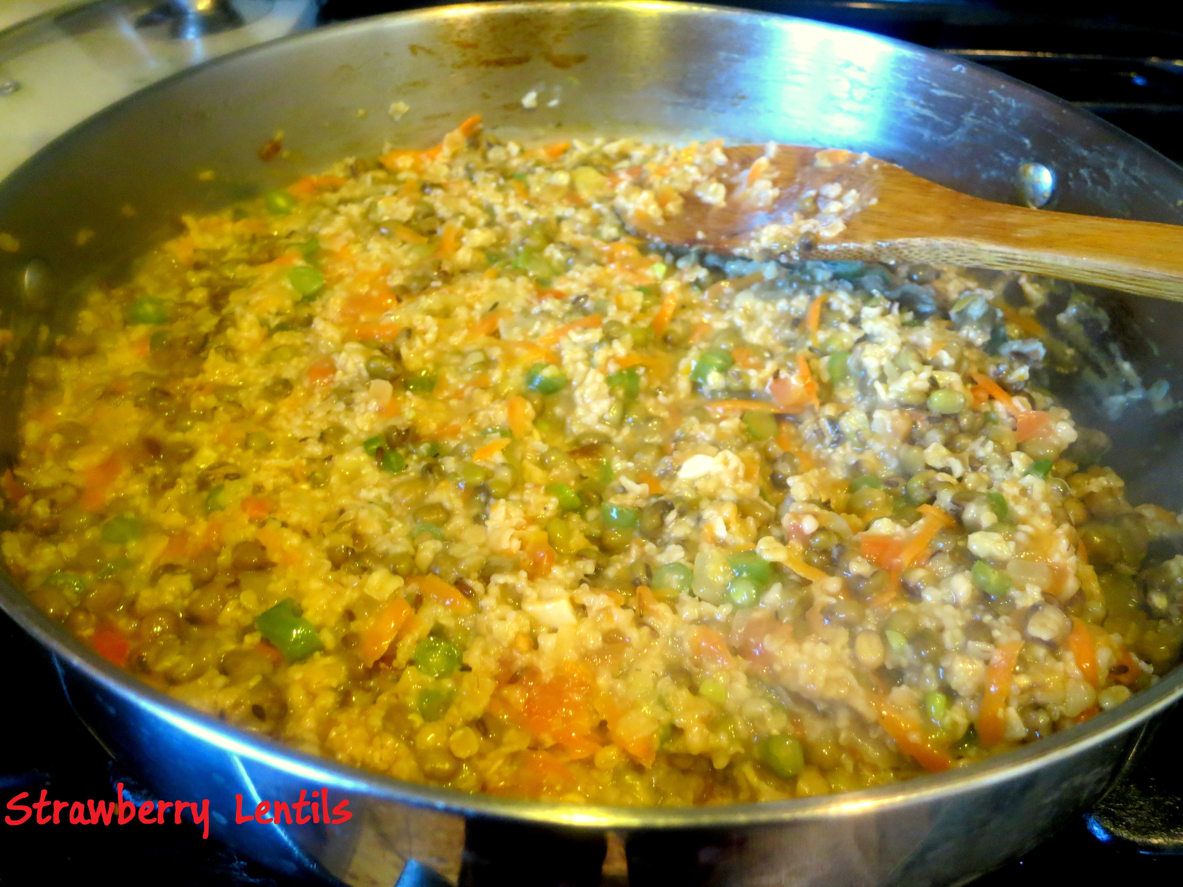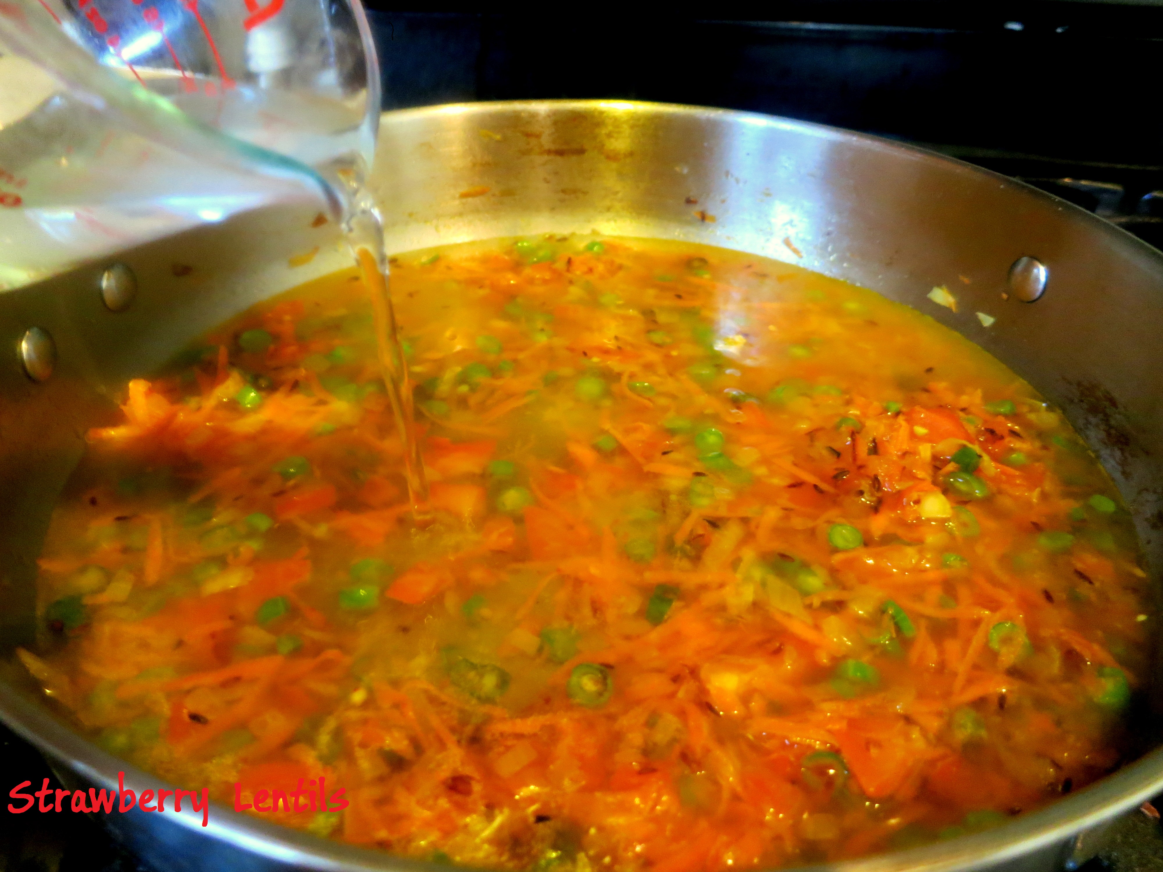- In a pot, heat a spoon of oil, and fry seasoning of your preference. I fried mustard seeds and urad dhal as I like the nutty flavors they bring. You can use cumin instead or garam masala (cloves, cinnamon and cardamon). Then saute the onions until translucent, and then the green chillies and ginger and the finally add the carrots, beans and peas. Add salt to sweat the veggies.